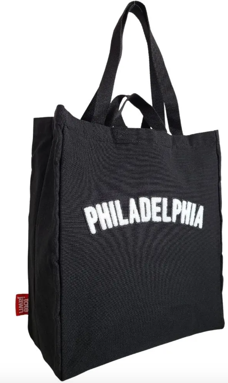 Poly cotton black canvas tote bag featuring double handles for you to carry in hand or on your shoulder. Inside pocket with reinforced piping, sewn side bag seams, and the signature tote jawn woven label on the back. These bags are hand-sewn by actual humans, slight size variations may occur between bags.