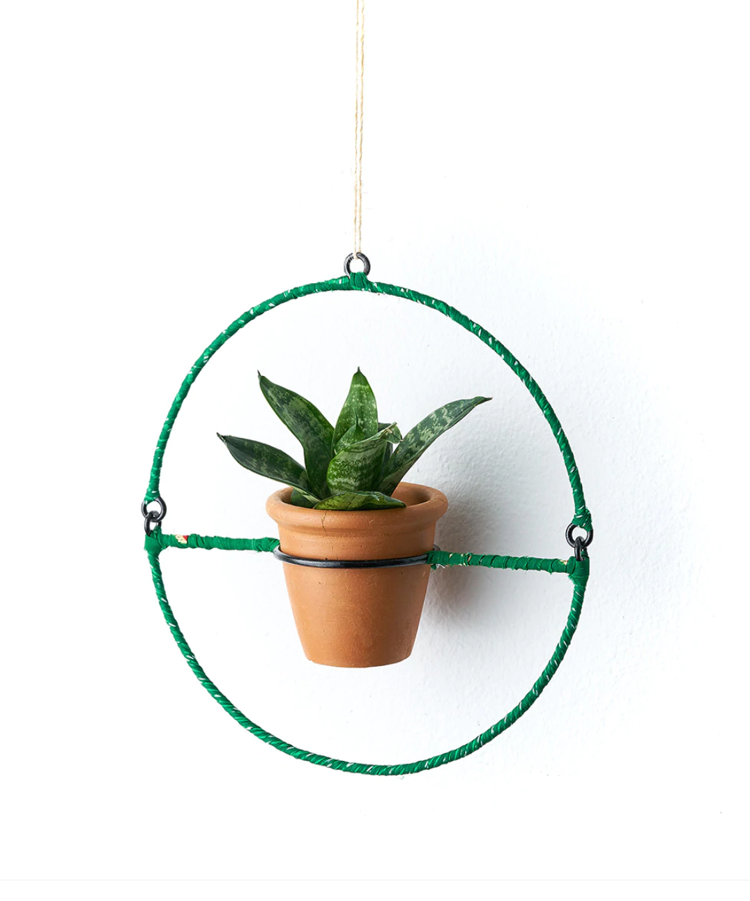 Vibrant, upcycled sari accents provide for a one of a kind quality. Handcrafted hanging planter features small terracotta pot suspended in an airy hoop setting with assorted, upcycled sari wrapping. With drainage hole.